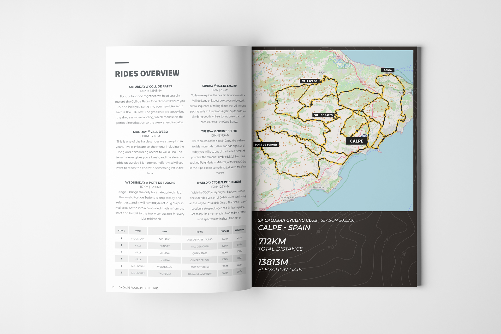 Only a few more hours to wait for the riders before flying to Alicante. Time to take a last look at our Roadbook? How do I pack? Where will I stay? Who will I ride with? Which routes? This 52-page magazine, released one week before each camp, will answer any questions and provide you a lot of information about your week at the Sa Calobra Cycling Club.